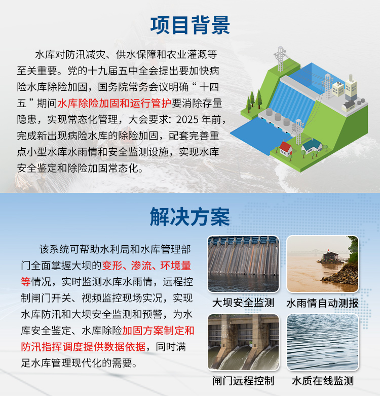 包含子系统有:雨情自动监测 ;水位自动监测系统;水利设施安防报警系统;水库大坝安全监测系统;灌区监测等