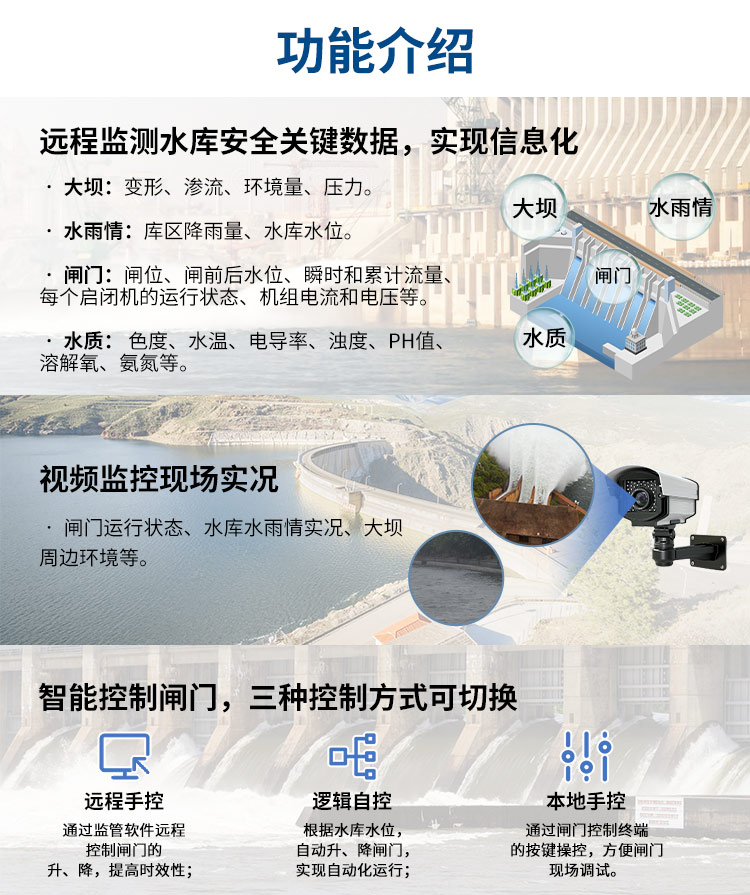 主要功能:①水位监测 ②雨量监测 ③视频监测 ④流速流量监测;实时监测,支持无线传输,远程大屏显示;