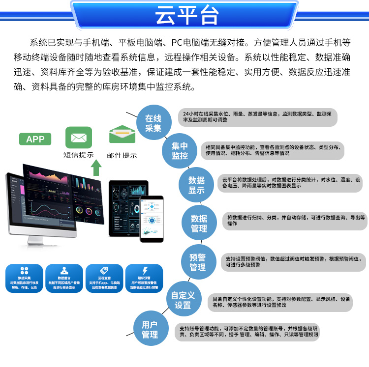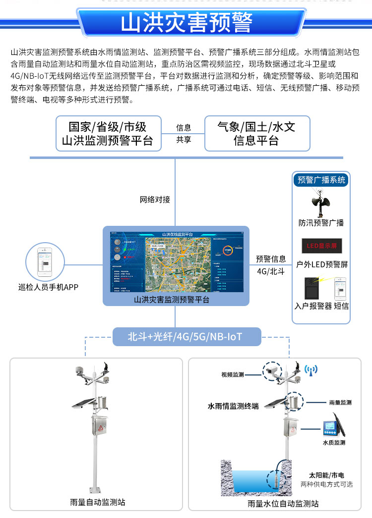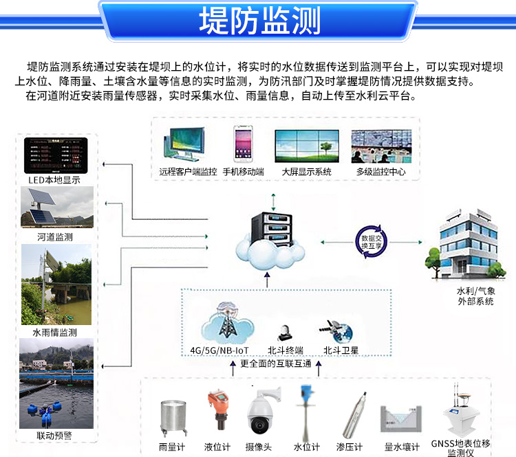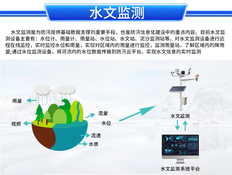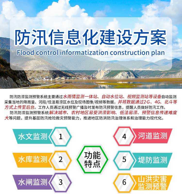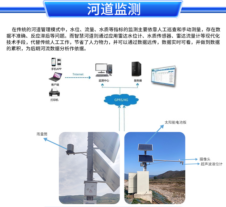 通过水雨情监测站,水位站,视频监测站等实现:水文监测 ;水库监测;水闸监测;河道监测;堤防监测;山洪灾害监测预警;