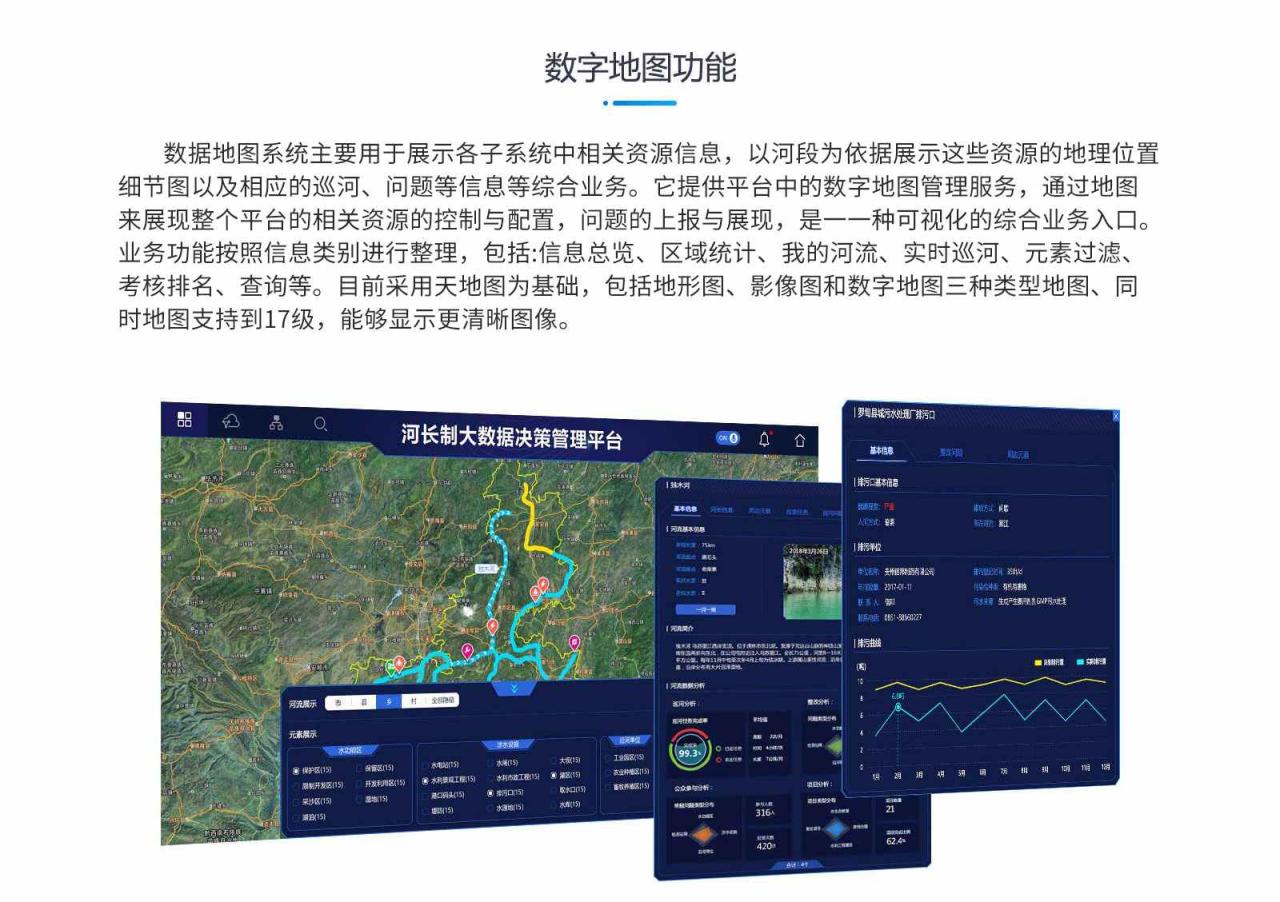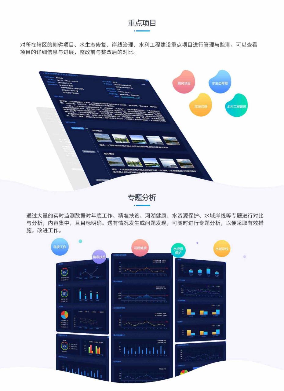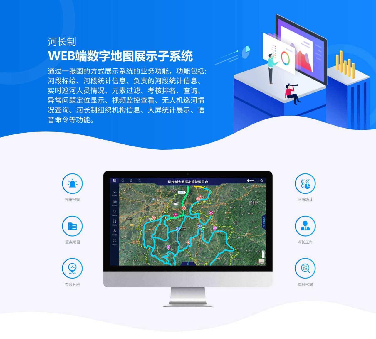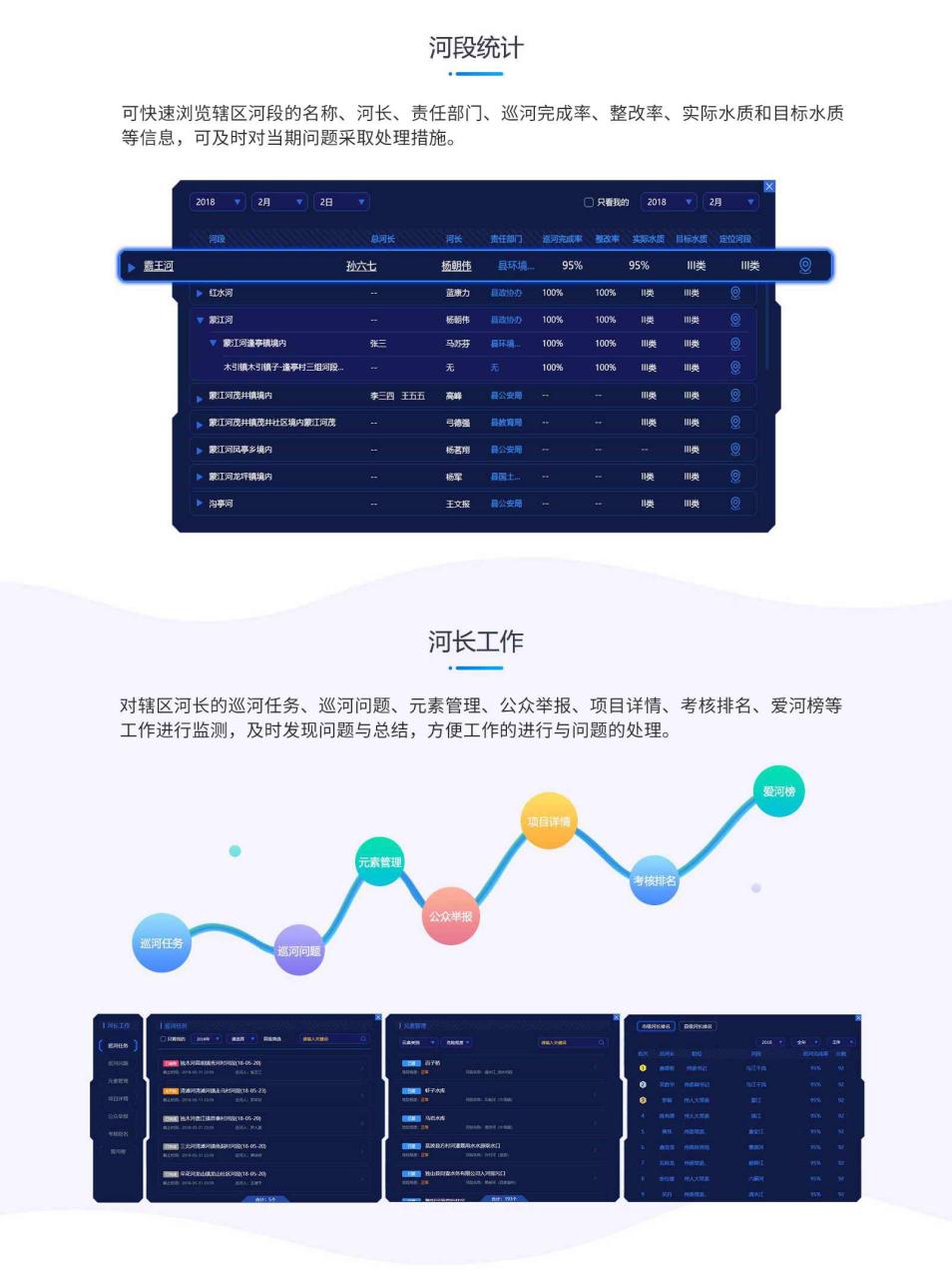 依照河长制网格化管理要求,实现河湖长巡河管理和事件处理功能;管理考核评估功能;基础信息查询功能;实现河湖动态监测功能;